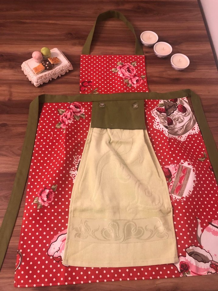 Bu mutfak önlüğü, beyaz puantiyeli açık kırmızı kumaş ve nakışlı çiçek desenlerine sahiptir. Yeşil askısı ve desenli açık yeşil çıkarılabilen havlusu bulunur.