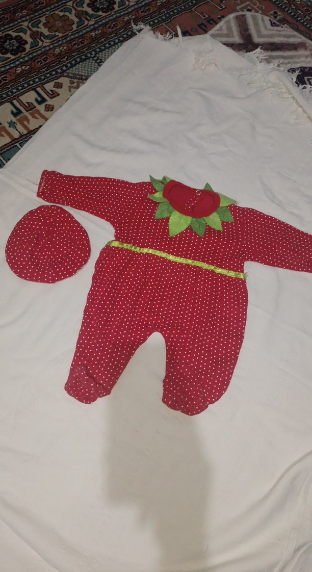 Nakışlı desenli, kırmızı örgü bebek tulumu ve uyumlu şapka. Yaka kısmında yeşil yaprak detayları bulunur.