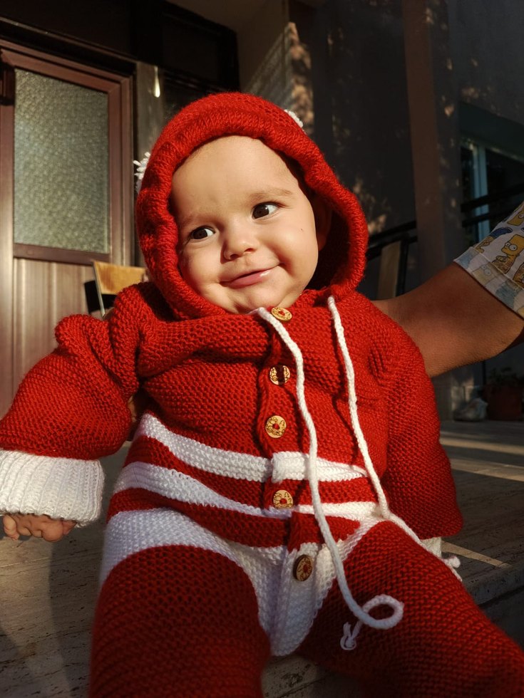 Nakışlı ve kapüşonlu, düğmeli kırmızı örgü bebek tulumu, yumuşak dokusuyla rahatlık sağlar. ❄️ el emeği.