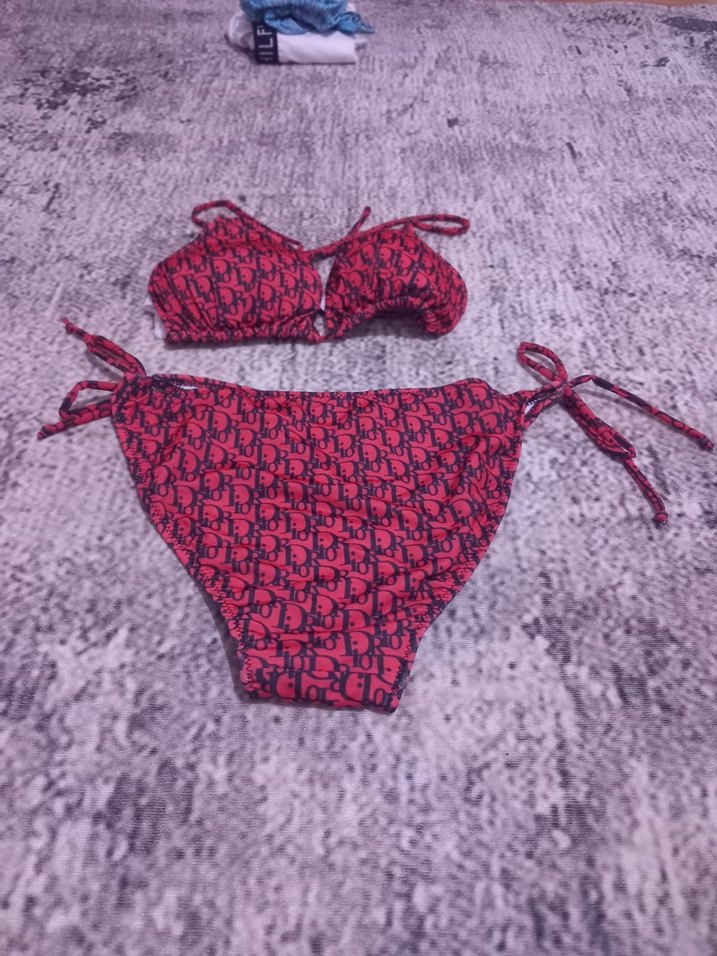 Nakışlı desenli, örgü kumaşlı, askılı, kırmızı renkli, kısa ve dar kesim bikini takımıdır. XL ve XXL bedeni mevcuttur
