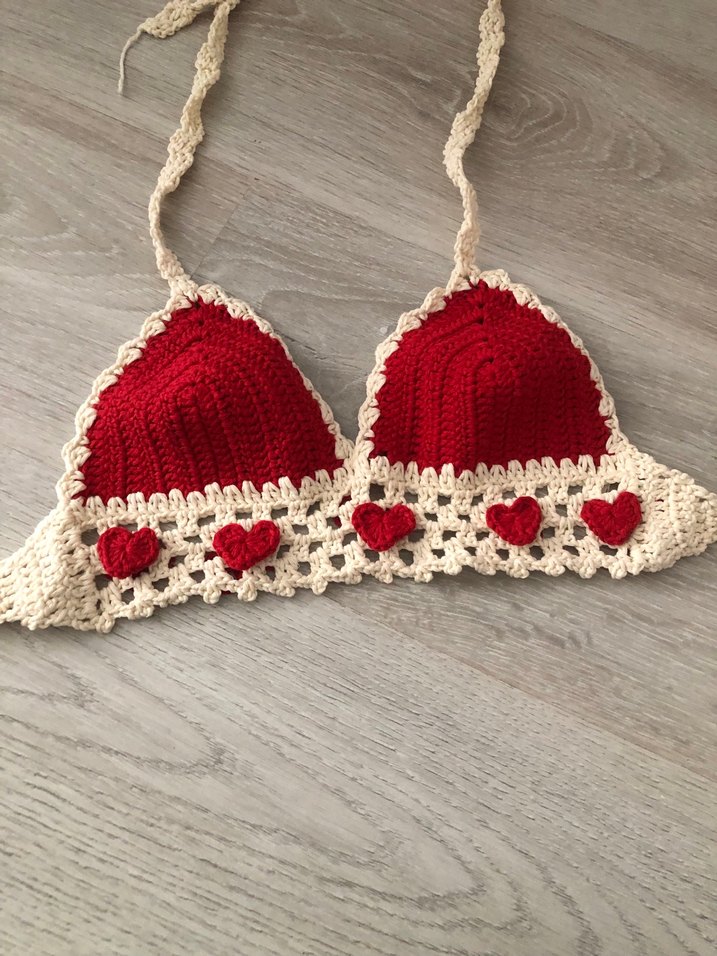 Nakışlı kalp detaylı, açık kırmızı örgü büstiyer, straplez tasarım ve kısa boy. Fitted kesimle bohem tarzda, romantik akşamlar için ideal. ❤️ Sıfır ürün 75 b beden yazlık iple örüldü