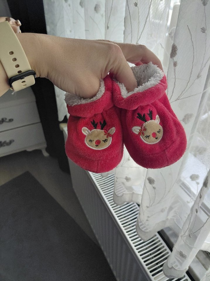 Renkli nakış detaylı, kırmızı örgü çocuk ev ayakkabısı, yumuşak ve sıcak iç yüzeylidir. alti kaydırmaz.numara yok bilemiyorum.oglum 1yasina kadar giydi yani