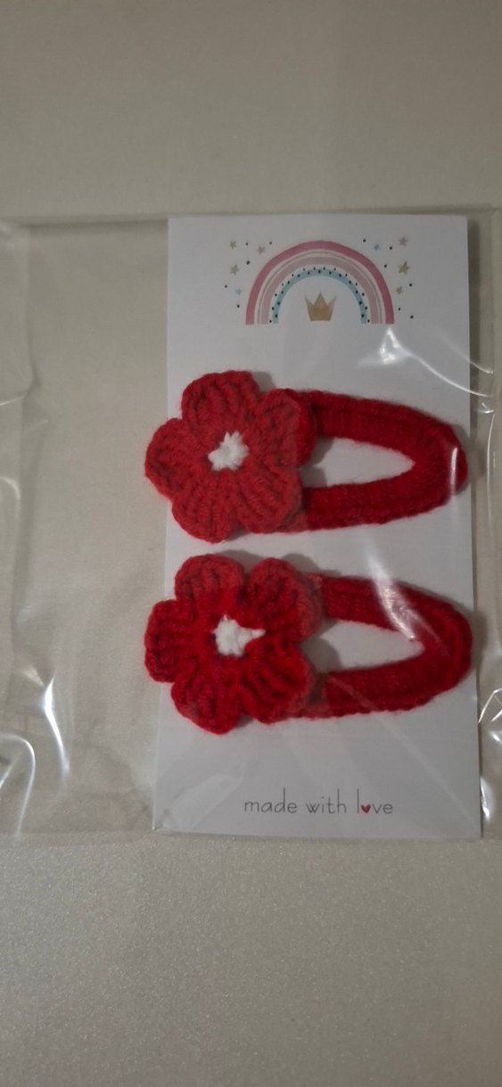 Nakışlı çiçek desenli, kırmızı örgüden yapılmış iki çocuk tokası seti. 6 cm büyüklüğünde çoklu alımlarda fiyat düşürülebilir