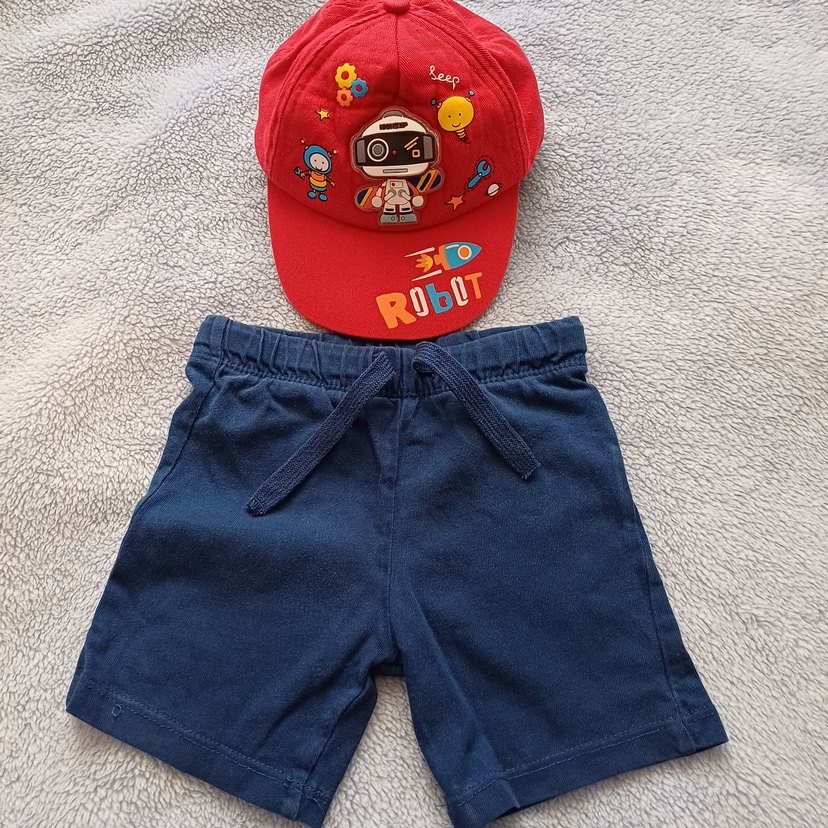Lastikli bel ve bol kesim denim şort ile robot nakışlı, cırt cırtlı kırmızı şapka. Erkek çocuklar için rahat ve renkli sokak stili. şapka ışıklandırma renkli ışıklar yaniyor