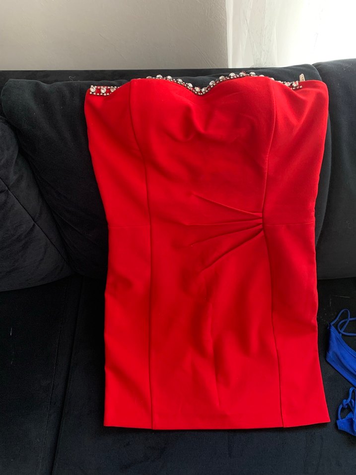 Nakış detaylı, kırmızı, straplez ve kalıplı midi elbise. Fermuarlı ve kolsuz, gösterişli parti davetleri için uygun.
