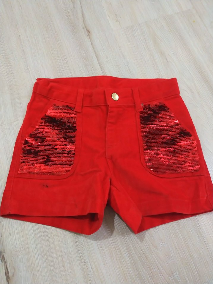 Düğmeli, nakışlı cepleriyle renkli kırmızı süet kız şortu, trend sokak stili için uygun.