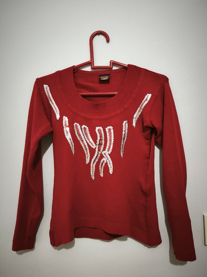 Fitted kesim, uzun kollu kırmızı triko kazak, nakışlı desenlerle süslenmiş. Renkli ve avant-garde tarzda, günlük kullanıma uygun.