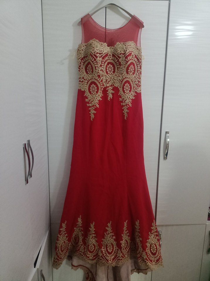Nakışlı, straplez kırmızı elbise, drapeli ve vücuda oturan kesimiyle düğünler için uygundur. Parlak görünümü ve klasik şıklığı yansıtır.