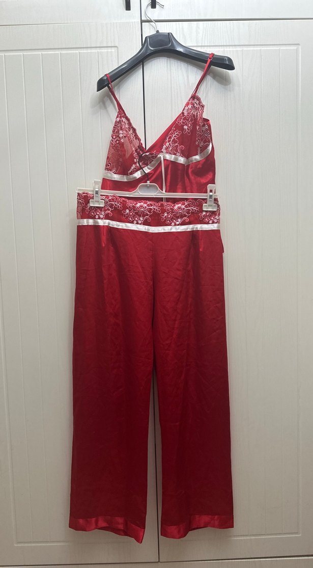 Nakışlı detaylara sahip, parlak kırmızı kumaştan, ince askılı ve uzun kesim kadın pijama takımı. Rahat ve klasik tasarım sunar.