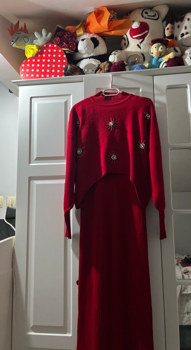 Dar kesim, uzun kollu ve bisiklet yaka kırmızı triko elbise. Nakışlı detayları ve parlak rengiyle rahat ve şık bir görünüm sunar. Günlük kullanım için uygundur. S-m-l hepsine uygundur esnek kumaşa sahiptir 1 kere giydim
