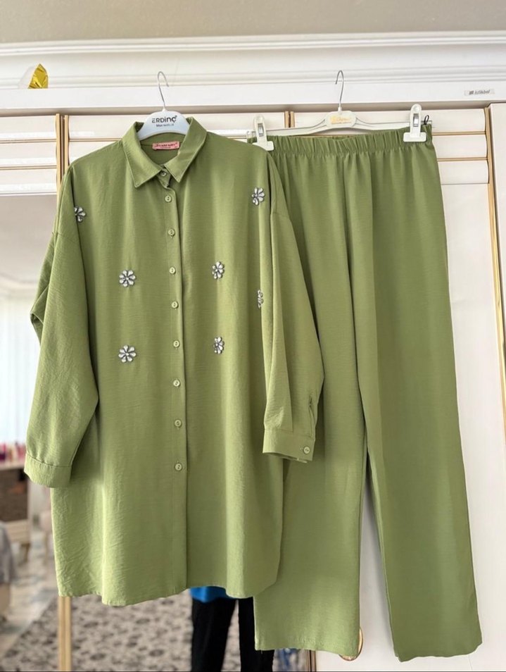 Yumuşak keten kumaştan, nakış detaylı, düğmeli ve uzun kollu kırmızı kadın takımı. Salaş kesim ve yaka detaylarıyla günlük rahat kullanım için uygundur. (Adet fiyatı 700 tl)