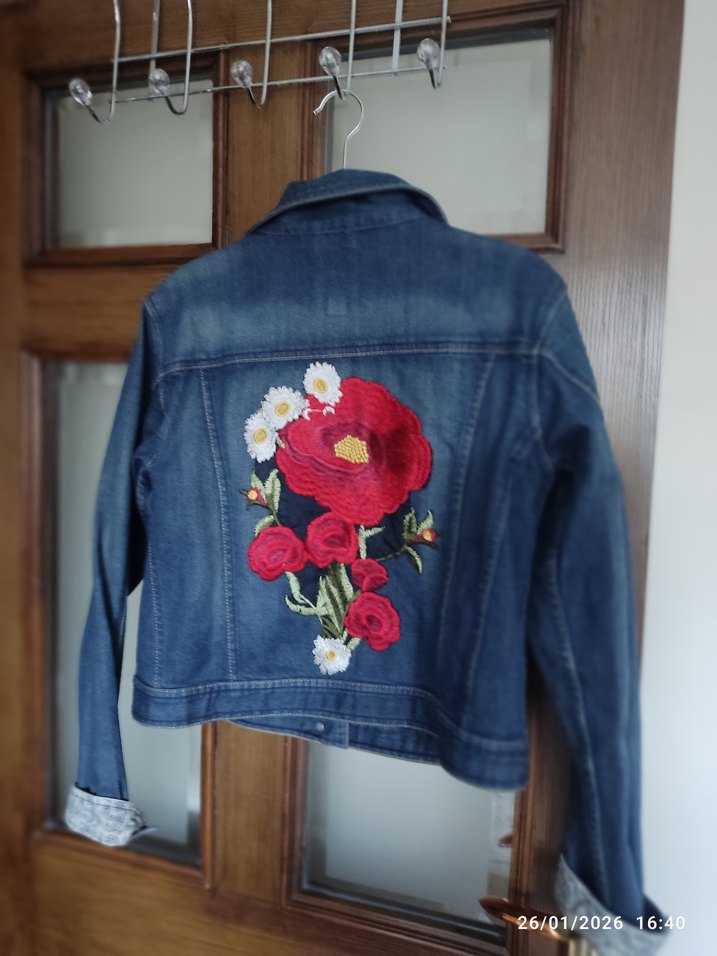 Uzun kollu, yakalı ve düğmeli kadın kot ceket. Arkasında nakışlı çiçek deseni bulunur. Kısa kesim, rahat kesim ve koyu kırmızı tonlardadır.
