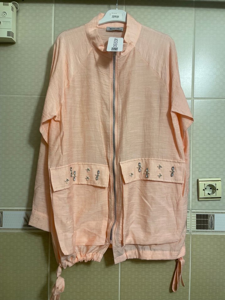 Nakışlı detaylı, düğmeli cepli, keten kumaştan, kısa kesim bol kadın ceket. Uzunkollu ve straplez yakalı, pastel bej renkte, günlük rahat kullanım için uygun.