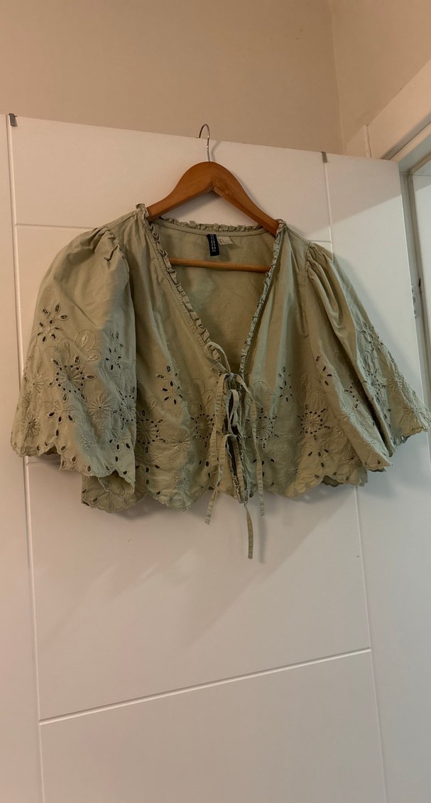 Nakışlı desenlere sahip, kısa kollu haki keten bluz. Straplez yaka ve düğmeli ön kısmı ile bohem tarzı yansıtır.