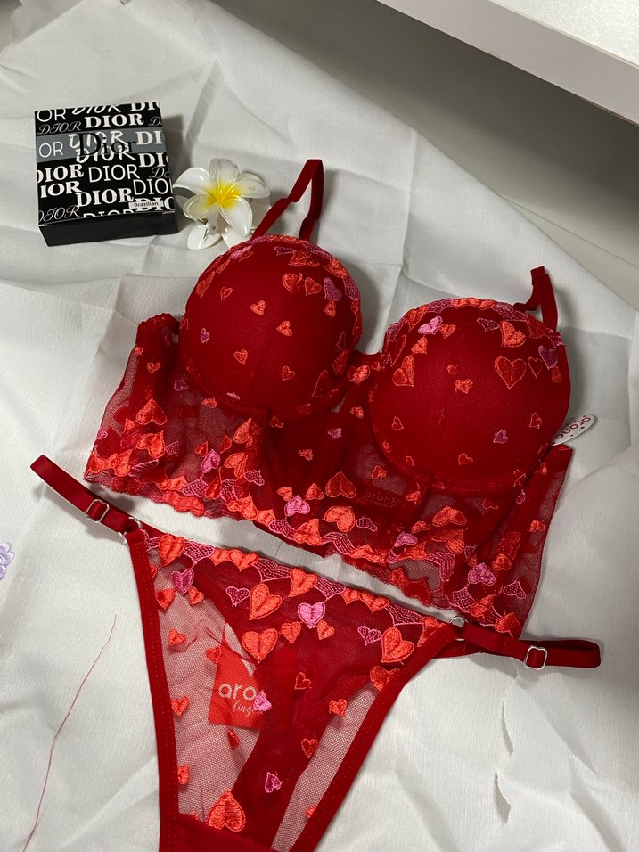 Nakışlı renkli kalp desenleriyle kısa, bohem tarzda kırmızı sütyen takımı. Ayarlanabilir askılı ve Dior esintili mini külot içerir. ❤️