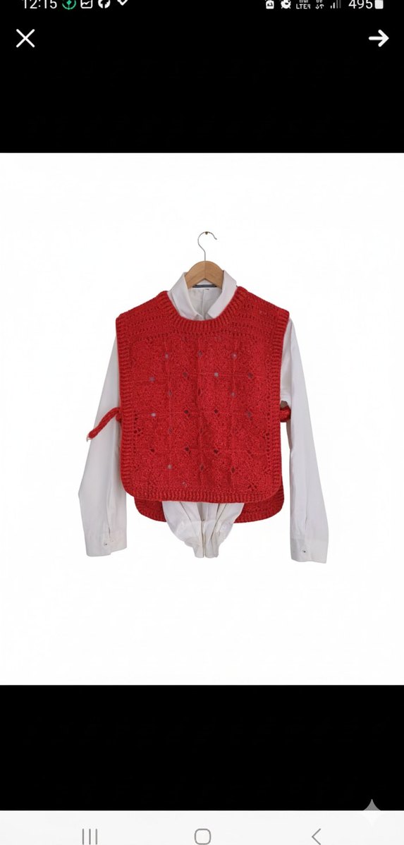 Nakışlı renkli desenlere sahip, kısa boylu, yuvarlak yakalı, salaş kırmızı triko süveter. Rahat ve bohem tarzda, günlük kullanıma uygun.