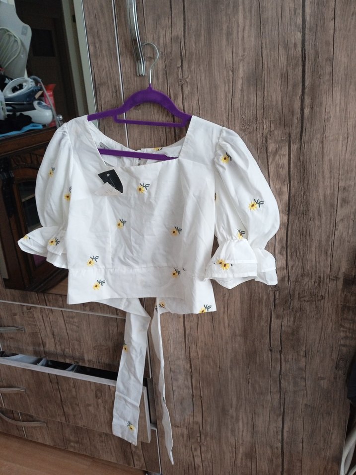 Pamuk kumaştan, nakışlı desenlere sahip, kısa kollu ve bol kesim beyaz bluz. Halter yaka ve düğme detayları bulunur. Bohem tarz için uygundur.