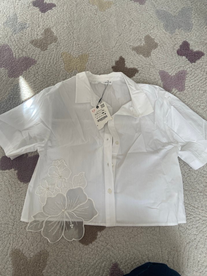 Pamuklu, kısa kollu, yakalı ve düğmeli beyaz gömlek. Mini boy ve bol kesim, nakışlı çiçek detaylarıyla günlük sokak stiline uygun.
