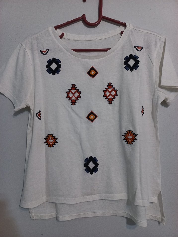 Nakışlı, geometrik desenlere sahip beyaz kısa kollu tişört, bol ve kısa kesimiyle günlük kullanıma uygundur. Omuzdan ön boy 48cm, omuzdan arka boy 52cm, göğüs genişlik 43cm, kol boyu 13cm'dir. S bedene uygundur. marka hatırlamıyorum