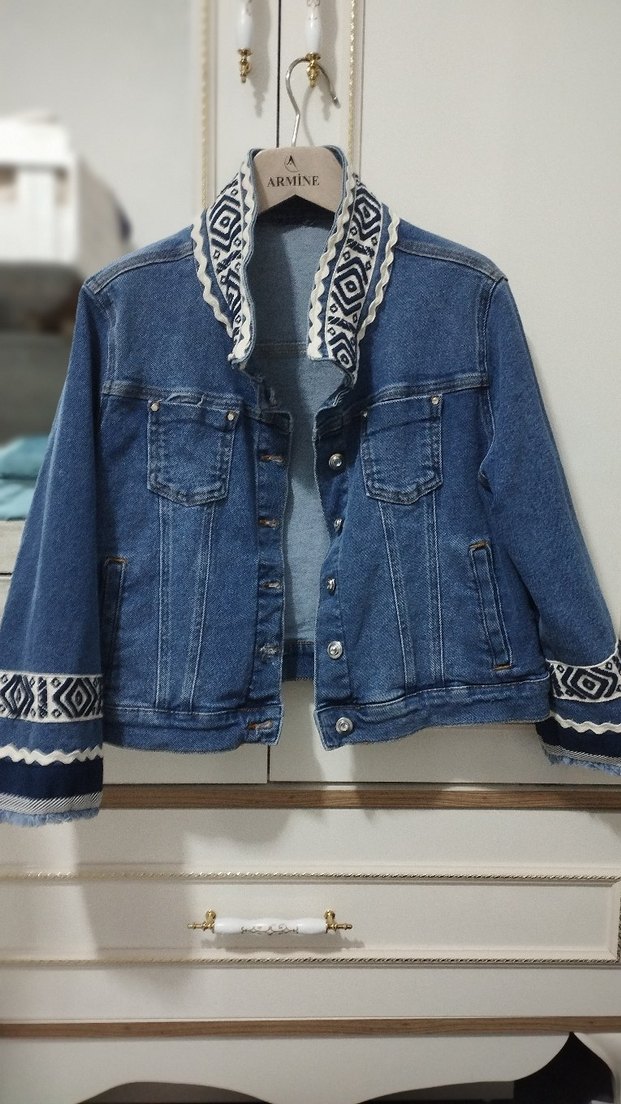 Mavi denim kumaştan, nakış detaylı yakası ve manşetleri olan, düğmeli, kısa kesim, uzun kollu, regular fit kadın ceket. Günlük kullanıma uygundur. ARMINE markalı.