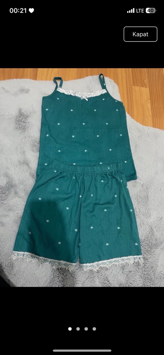 Nakışlı desenli, dantel detaylı, kolsuz ve kısa yeşil kadın pijama takımı, rahat ve bohem tarzda tasarlanmıştır.