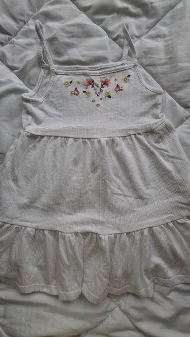 Beyaz pamuk kız çocuk elbisesi, straplez yaka ve nakışlı çiçek detaylarına sahiptir. Bol kesim ve fırfırlı katmanlarıyla bohem tarzındadır. kullanılmamıştır.