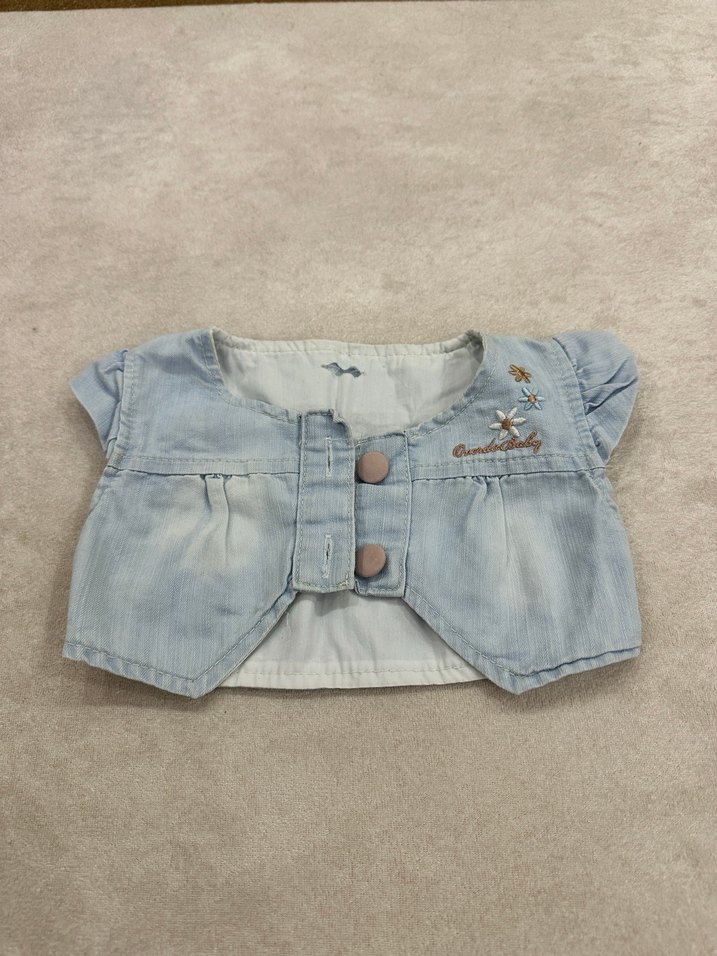 Kız çocukları için düğmeli, nakışlı ve straplez yaka detaylı, fitted kesim denim yelek. Sokak modasına uygun, kolsuz tasarım. Boy 19 cm (5.ç) #bebek #giyim #kıyafet