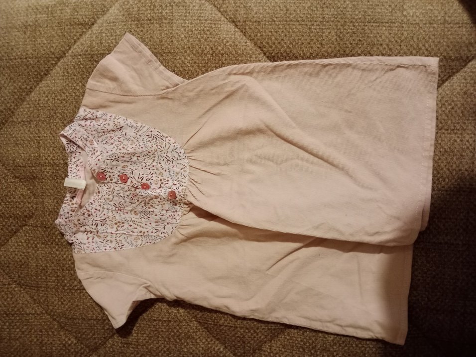 Bej keten kız çocuk elbisesi, kısa kollu, V yaka, nakışlı detaylar ve düğmelerle bohem tarzda, bol kesimdir.