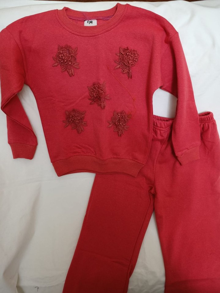 Kırmızı, nakışlı çiçek detaylı sweatshirt ve örme eşofmandan oluşan bol kesim kız çocuk takımı. Rahat ve renkli günlük giyim.