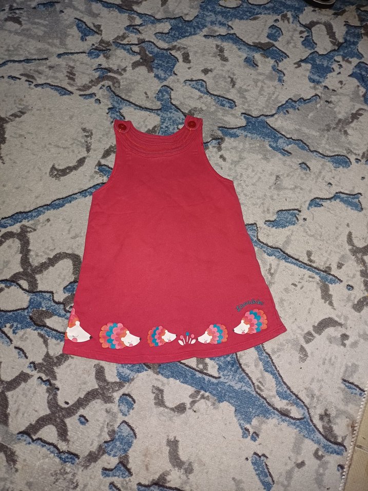Kolsuz, yuvarlak yaka, bol kesim kırmızı elbise. Yumuşak ve sıcak örme kumaştan üretilmiş, etek kısmında renkli nakış detayları bulunur.
