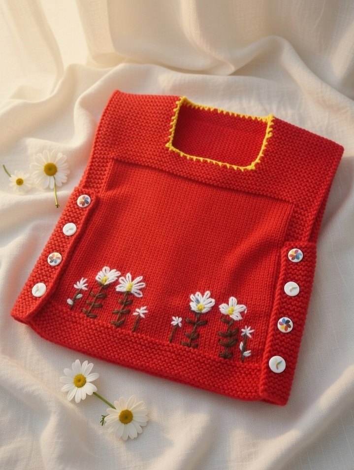 Kırmızı renkli, nakışlı çiçek detayları ve beyaz düğmelerle süslenmiş,kız çocuk Örgü süveter. 1. 2 yaş