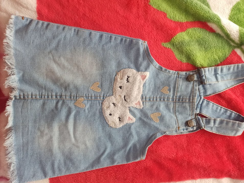 buz mavisi renkte, kolsuz, oturan kesim kot elbise. Ön kısmında nakışlı kedi yüzleri ve kalpler bulunur, arka kısmı düğmeli. salopet