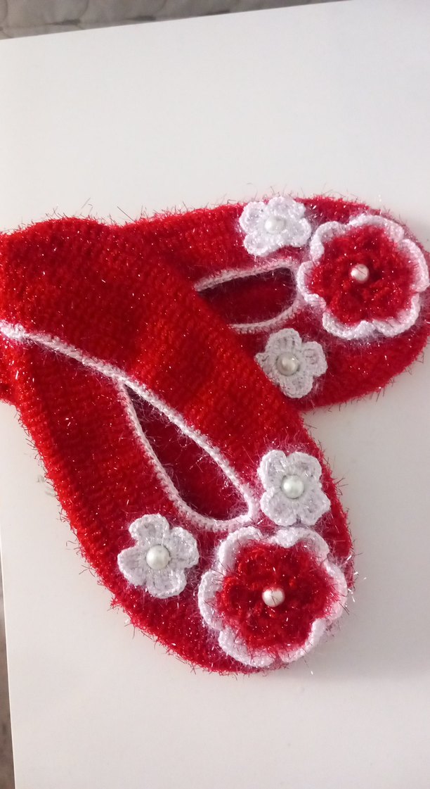 Kız çocukları için kırmızı renkli, nakışlı çiçek detaylı, yumuşak dokulu örgü eldivenler.