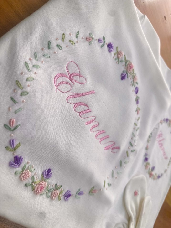 Pastel beyaz renkte, pamuklu kız çocuk bornozu, zarif nakışlı çiçek desenleri ve isim detayı içerir.