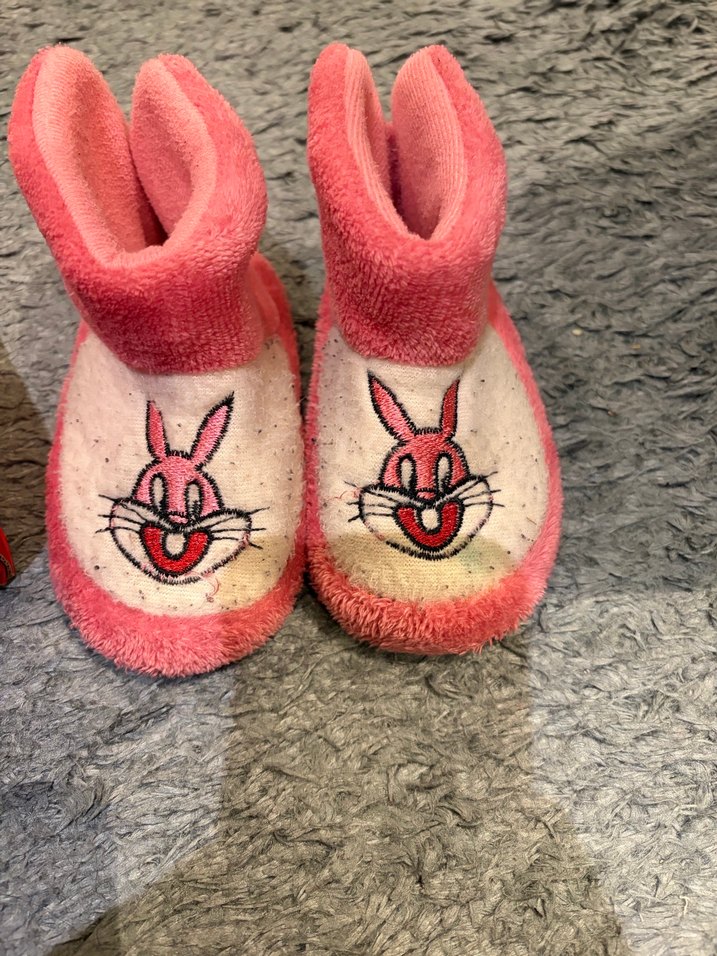 Nakışlı tavşan desenli, pembe, örgü dokulu kız çocuk terliği. Yumuşak ve sıcak, ev içi kullanım için uygundur.