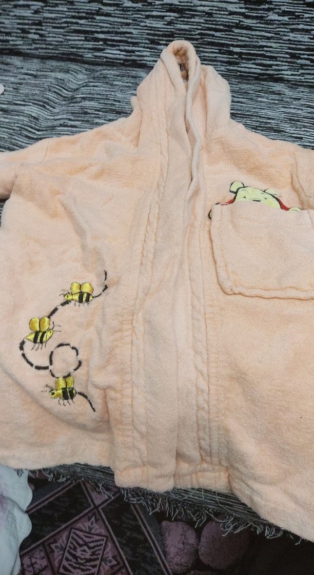 Bej renkli kız çocuk bornozu, yumuşak polar kumaş ve nakışlı arı desenleri ile rahatlık sunar, ön cepli.