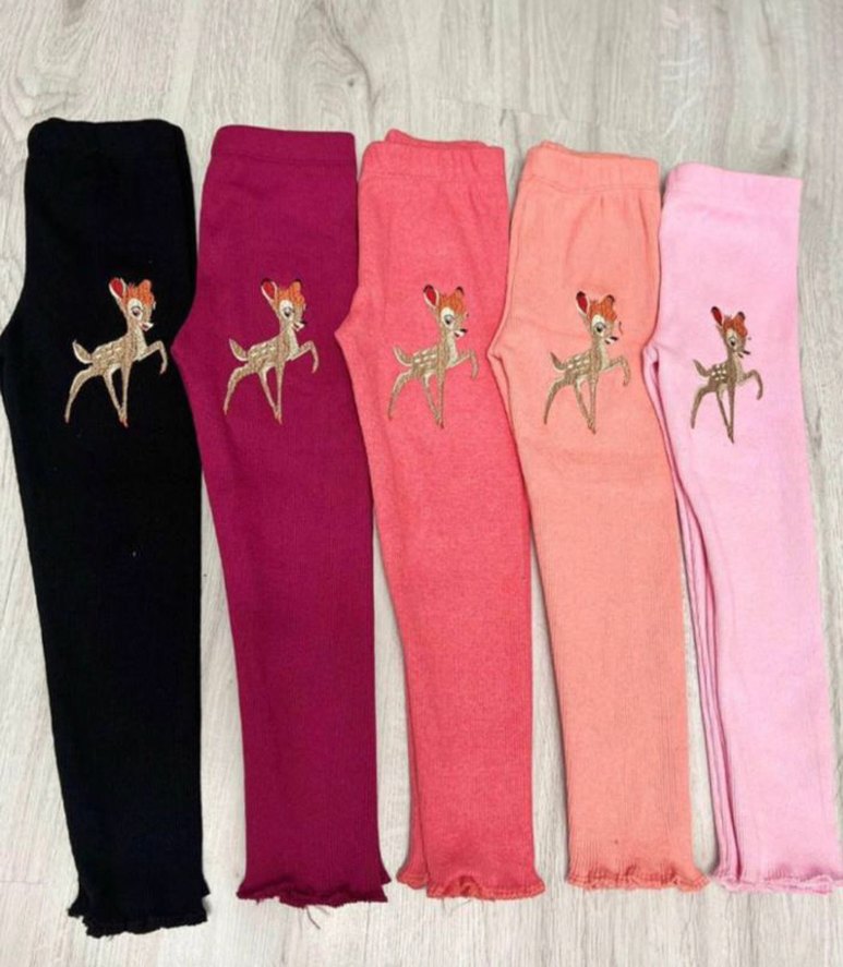 Nakışlı geyik figürlü, renkli ve ince kesim kız çocuk taytları. Yumuşak ve sıcak örme kumaştan, günlük sokak stili için uygundur.