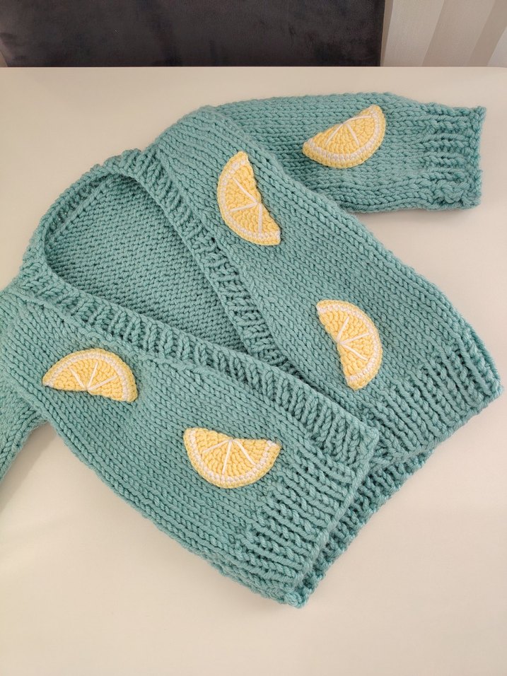 Limon dilim nakışlı, bol kesim, uzun kollu kız örgü hırka, bohem tarzda ve yumuşak dokuda.