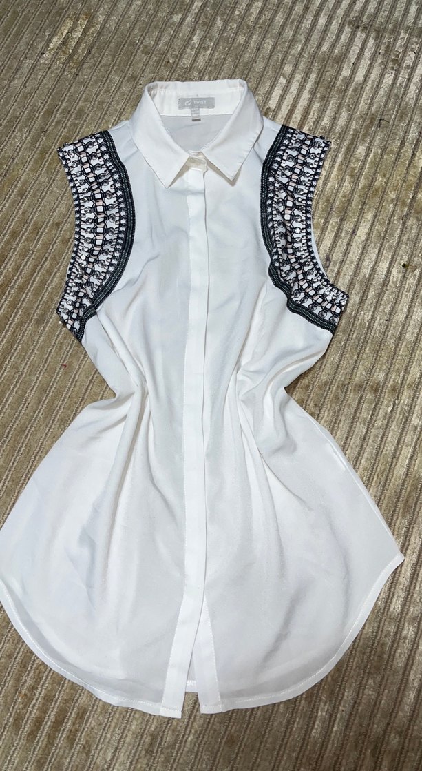 Kolsuz, yakalı beyaz gömlek, omuzlarda nakış detaylıdır. Düğmeli ön kısmı ve rahat kesimiyle günlük kullanıma uygundur.