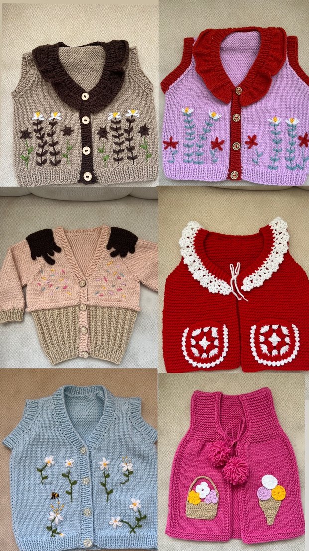 Nakışlı çiçek ve dekoratif desenlere sahip, hafif ve canlı renklerde, bohem tarzda, kolsuz, fitted kız triko yelekler.