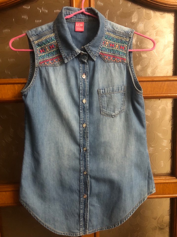 Kolsuz, yakalı ve düğmeli, fit kesim kız denim gömlek. Omuzlarda renkli nakış detayları bulunur. Pastel mavi renkte, bohem tarzda.