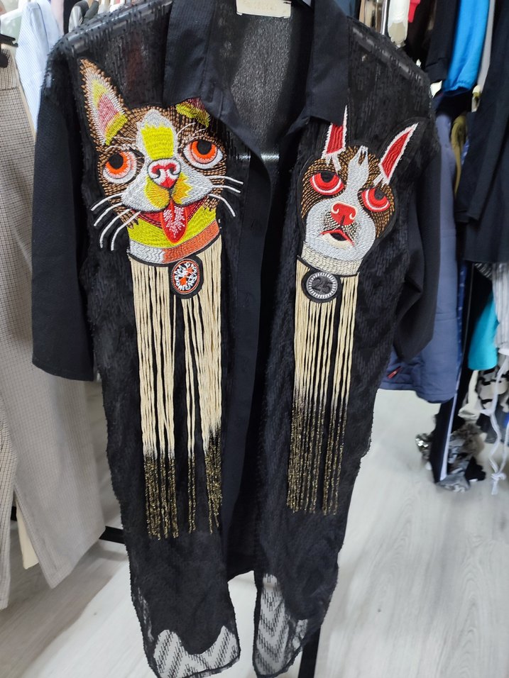 Nakışlı kopek yüzleri ve püskül detaylarıyla süslenmiş, organze tarz kumaş karanlık renkli sokak stili ceket.