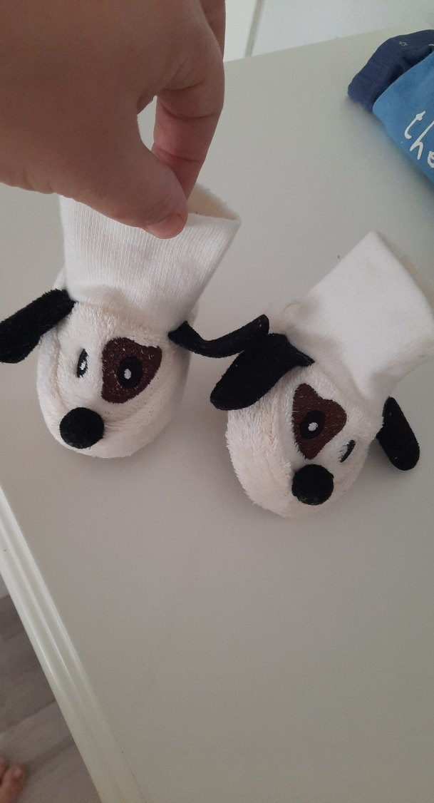 Beyaz renkte, nakışlı köpek figürlü ve renkli detaylara sahip yumuşak erkek çorabı. Ayakkabısı hiç giyilmedi etiketi söktüm dolapta durdu