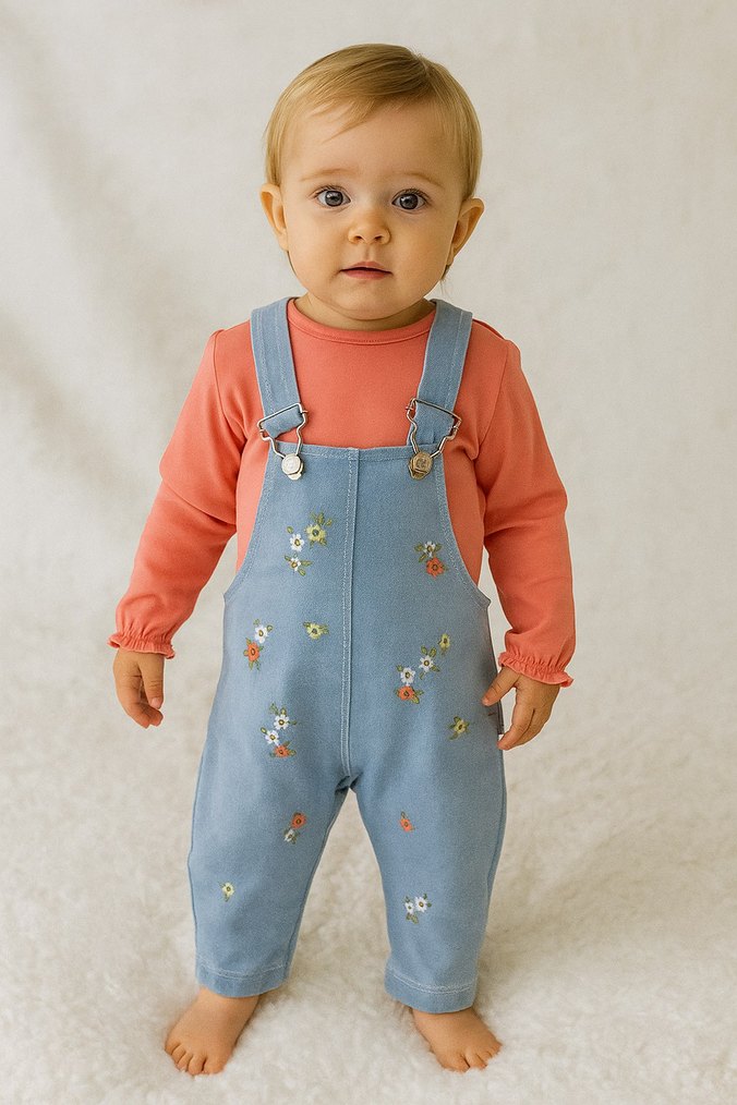 Renkli çiçek nakışlı, düğmeli askılı, bol kesim kot bahçıvan tulum. Üzerinde uzun kollu pembe bluz. Bohem tarz.