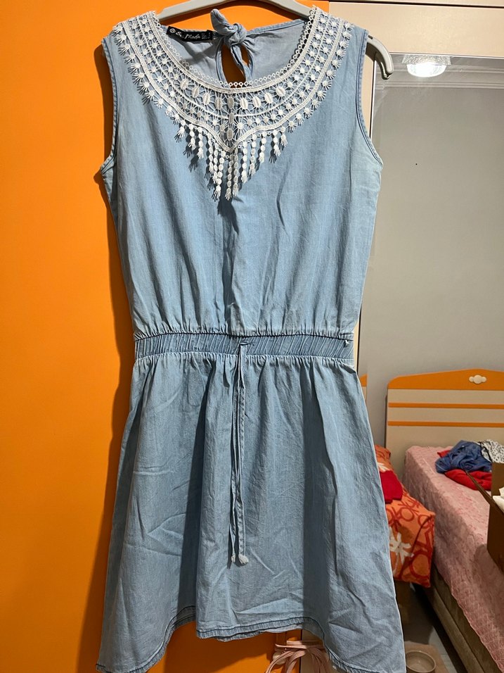 Nakışlı detaylı, kot kumaştan, kolsuz, halter yaka midi elbise. Belden kemerli, bol kesimdir. Rahat günlük kullanım için uygundur.