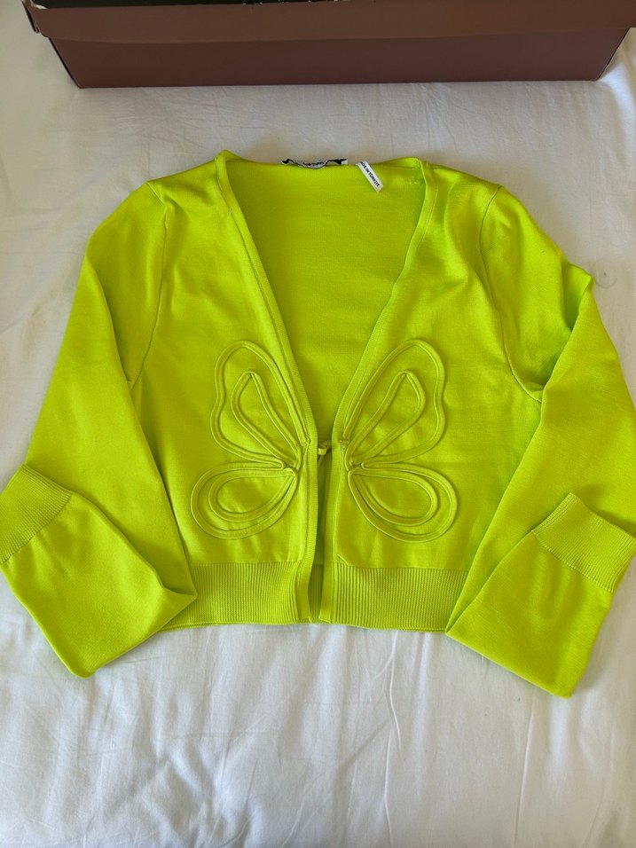 Uzun kollu, yuvarlak yakalı hırka. Yumuşak triko kumaştan, renkli işlemeli kelebek desenli, sokak modasına uygun.