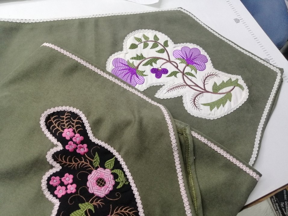 Koyu haki renkte, geleneksel nakışlı çiçek desenleriyle süslenmiş masa örtüsüdür.