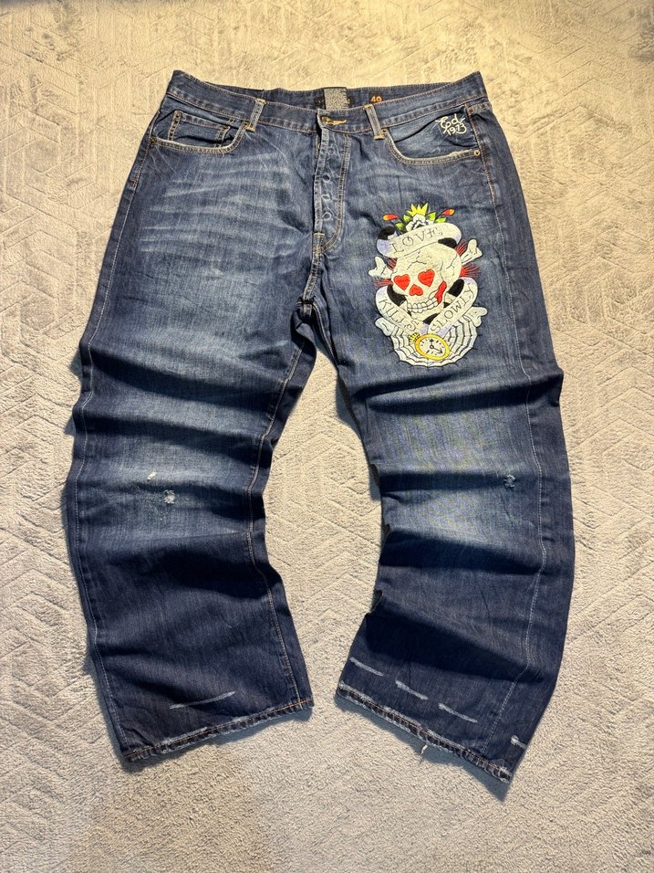 Koyu lacivert denimden, nakışlı ve tokalı detaylara sahip, rahat kesim midi boy jean. Günlük kullanıma uygun, rock punk tarzını yansıtır.