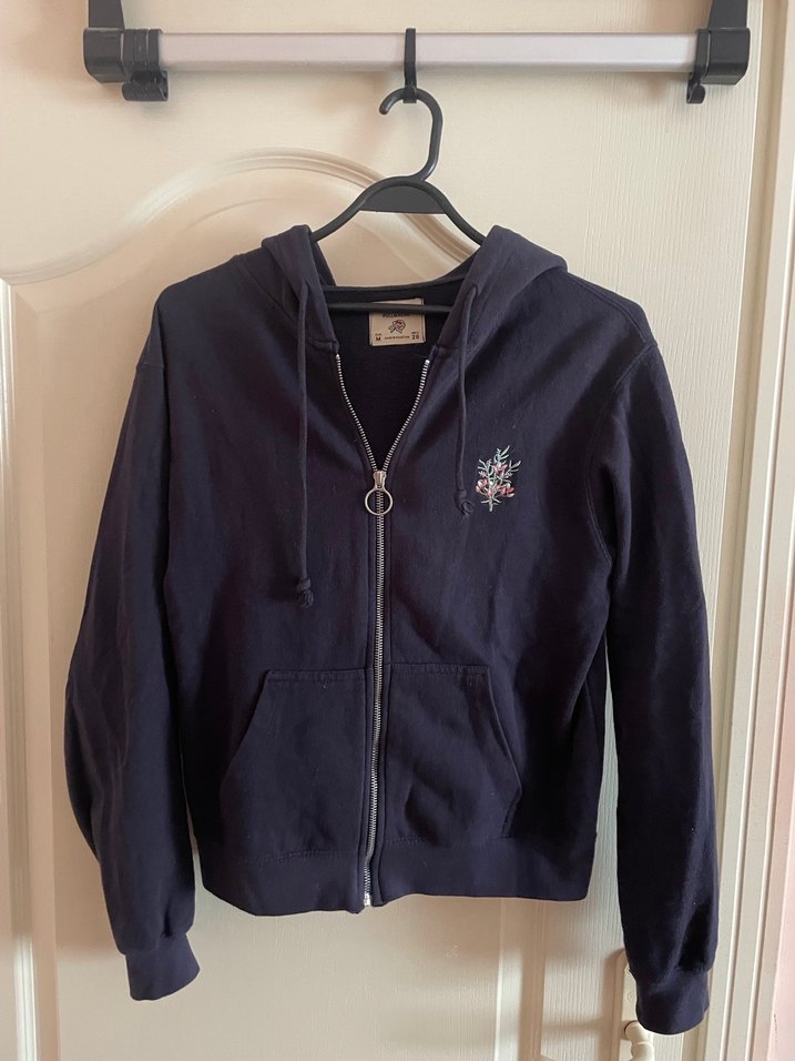 Koyu mavi fermuarlı ceket, kapüşonlu ve nakışlı detaylıdır. Uzun kollu, vücuda oturan kesimiyle yumuşak ve sıcak kumaştan üretilmiştir.