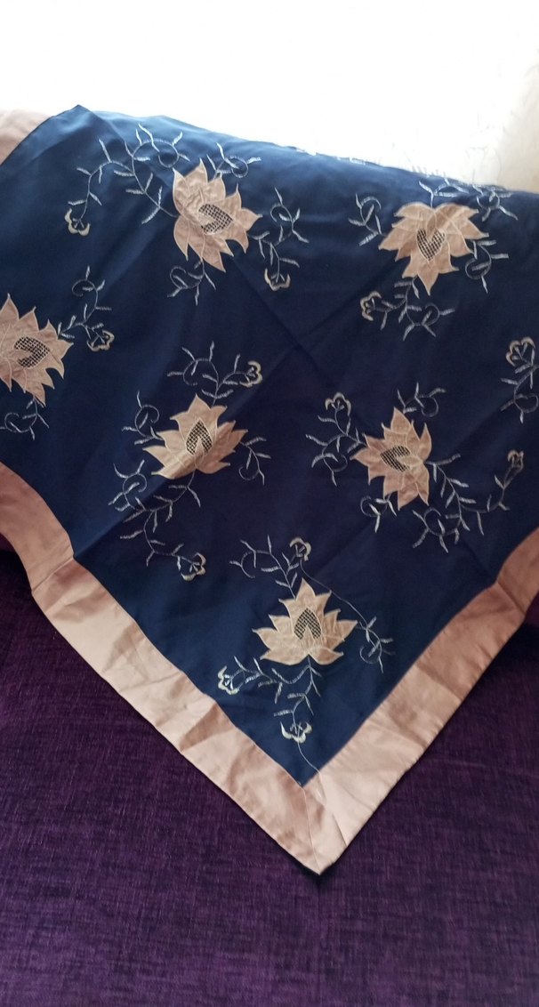 Nakışlı çiçek desenleri ve açık renk kenarlığı olan koyu mavi masa örtüsü, geleneksel tarz sunar.